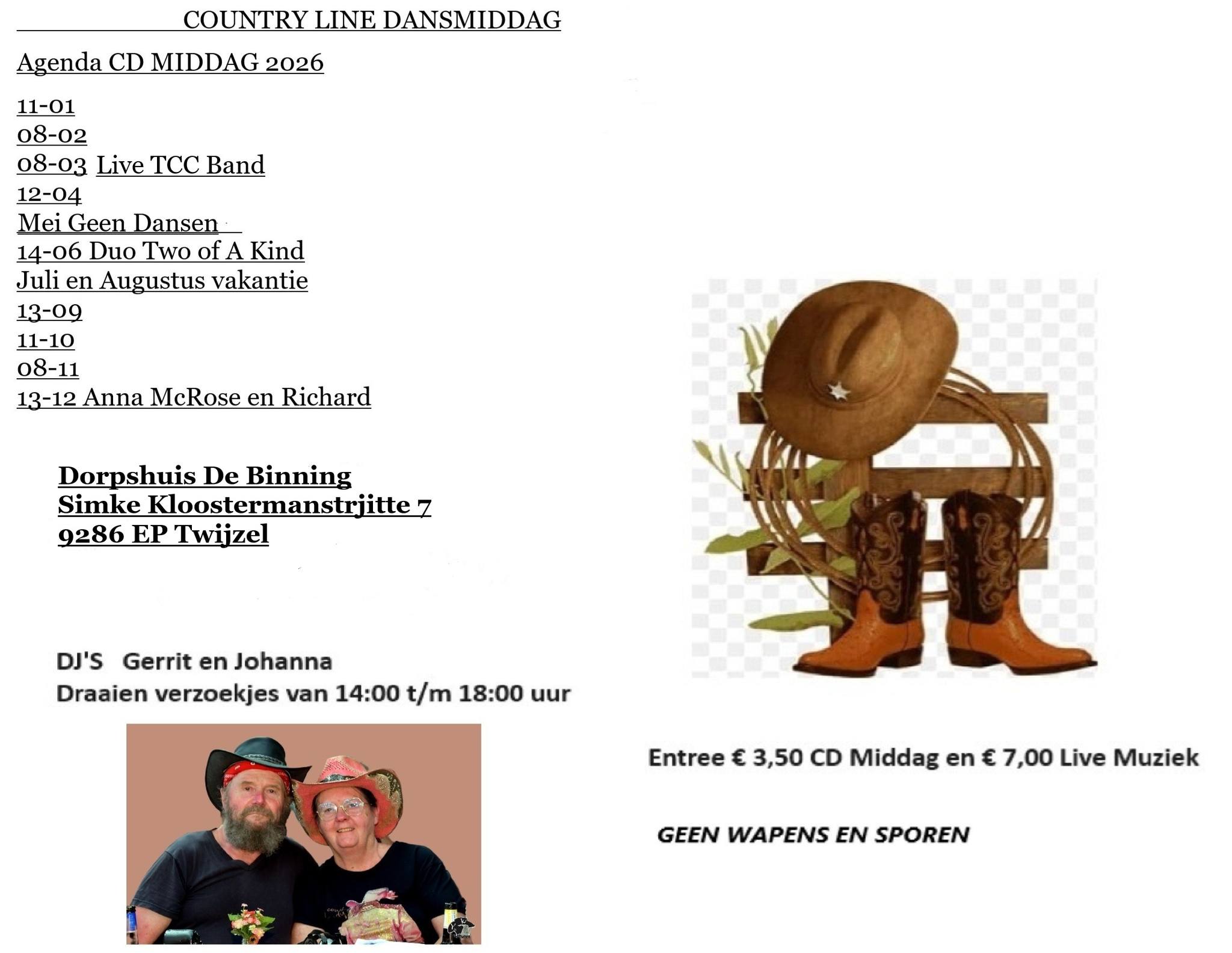 Zondag 8 maart - Country Line Dansmiddag met TCC band